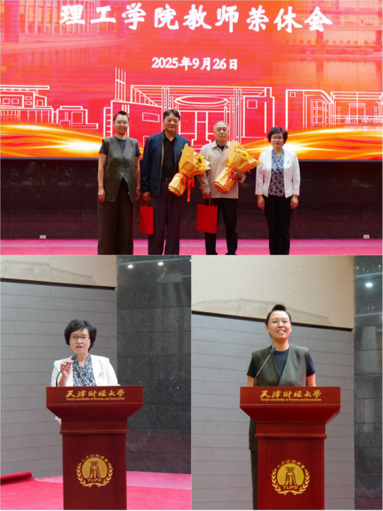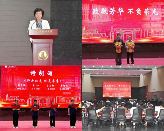 庆祝大会第一阶段为表彰环节,首先通过播放院庆活动视频,引领在场教师回顾了学院发展历程与教育教学成果。随后唐承秀院长发表致辞,向全体教师致以节日问候,围绕学校第三次党代会提出的新时代新征程的目标任务,阐述学院未来教育教学与科研发展规划,激励师生朝着“新财经”发展战略,新工科、新理科建设方向携手奋斗,共同谱写理工学院的精彩华章。四位学生代表带来诗朗诵《师者如光 照亮未来》,以真挚的情感、铿锵的语言,表达了对老师们的感恩与敬意,为现场增添了浓厚的节日氛围。青年教师代表杨会静、任彦勋为今年学院荣休的车维平书记和李永平教授献花,以“薪火相传”的仪式感,表达对前辈师长的敬意与传承其精神的决心。
