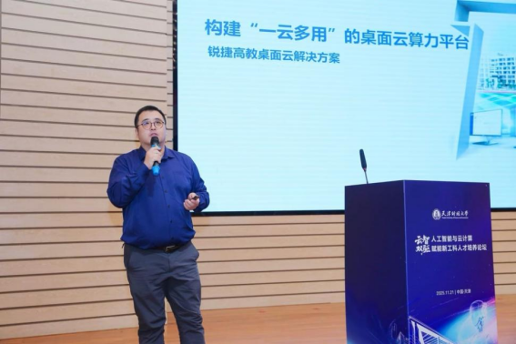 锐捷网络股份有限公司天津分公司技术总监何畔从技术支撑角度分享,为新工科建设提供产业视角。他介绍,锐捷“一云多用”桌面云平台以超融合架构整合多元虚拟化资源,适配公共机房、专业实训室等十大场景。支持按需分配算力、灵活配置参数,个性化实训桌面,实现了多端泛在访问,解决传统机房数据保存痛点,分级分权管理与数据统计功能已应用于多所高校。