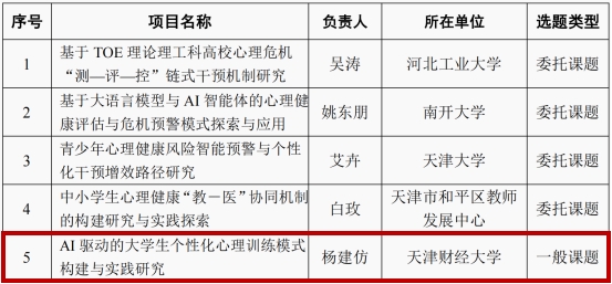 近日,天津市学生心理健康教育发展中心公布了2025年天津市心理健康教育研究专项课题立项名单,学院辅导员杨建仿老师主持的《AI驱动的大学生个性化心理训练模式构建与实践研究》课题成功获批立项。这一成果不仅是我院辅导员队伍深耕学生心理健康教育的生动体现,更彰显了学院在学生思想引领与心理育人工作中的积极探索。