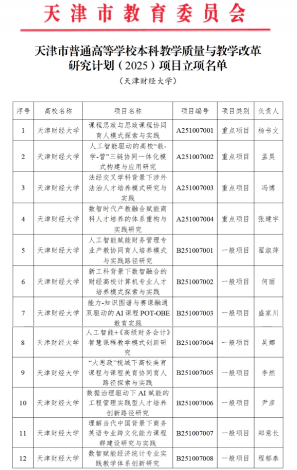 近日,天津市教委正式发布《市教委关于公布天津市普通高等学校本科教学质量与教学改革研究计划项目(2025)立项结果的通知》(津教高函〔2026〕4号),理工学院副院长何丽教授主持的《新工科背景下数智融合的财经高校计算机专业人才培养模式探索与实践》和计算机科学与技术学科带头人盛家川教授主持的《能力-知识图谱与赛课融合双驱动的AI课程POT-OBE教育实践》2个项目获批立项,充分体现了学院在教学研究与教学改革项目方面的高度重视与持续发力。