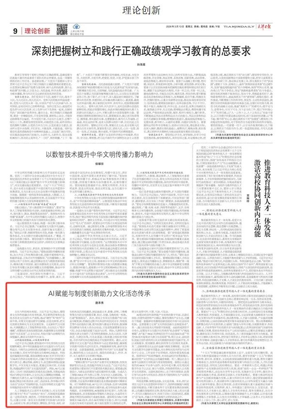 文化与科技相生相促。习近平总书记指出,要探索文化和科技融合的有效机制,用互联网思维和信息技术改进文化创作生产流程,推动“硬件”和“软件”全面升级,实现文化建设数字化赋能、信息化转型,把文化资源优势转化为文化发展优势。立足新时代文化使命,天津既要以人工智能等科技手段,为文化注入“数字魂魄”,更要依托系统性制度创新,构建保障文化持续繁荣的“生态系统”,让文化自信、科技自强与治理现代化深度融合,激活文化的时代生命力。