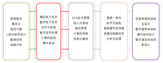 离散数学、C语言程序设计、数据结构与算法、操作系统、计算机组成原理、电路分析、模拟电子技术、数字电子技术、信号与系统、数字信号处理、信息论基础、通信原理、EDA原理与技术、计算机网络、多模态信号处理、干扰对抗等,并配有相应的实验课程和实践教学环节。